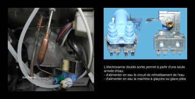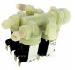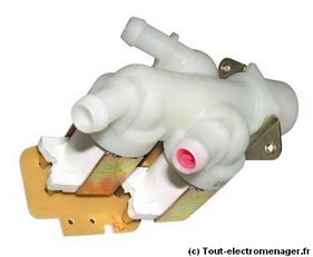 On peut avoir des électrovannes à quatre voies mais de plus en plus de machines sont équipées d'une électrovanne une voie (coût de production plus faible) et c'est une buse rotative qui distribue l'eau dans le bac approprié.